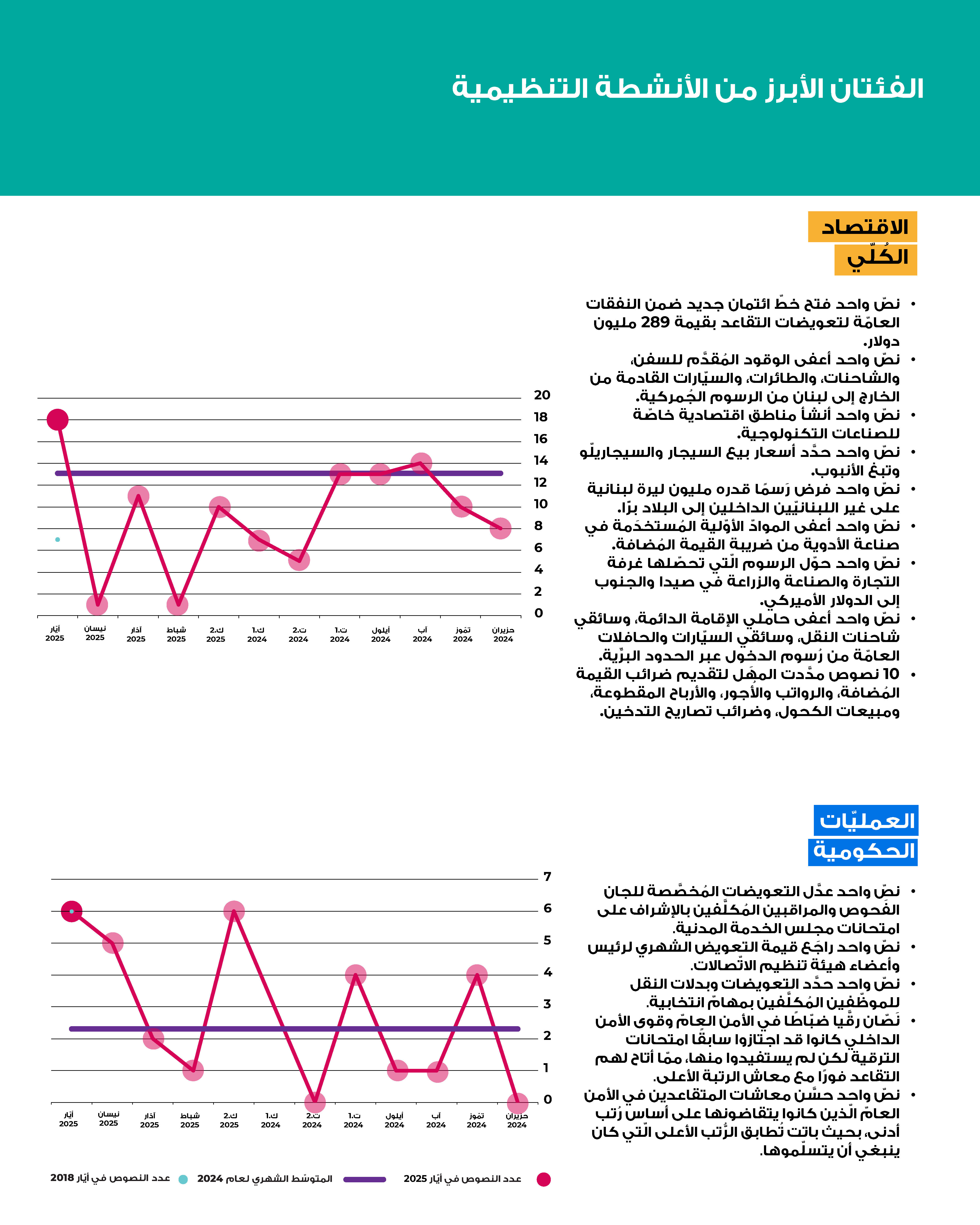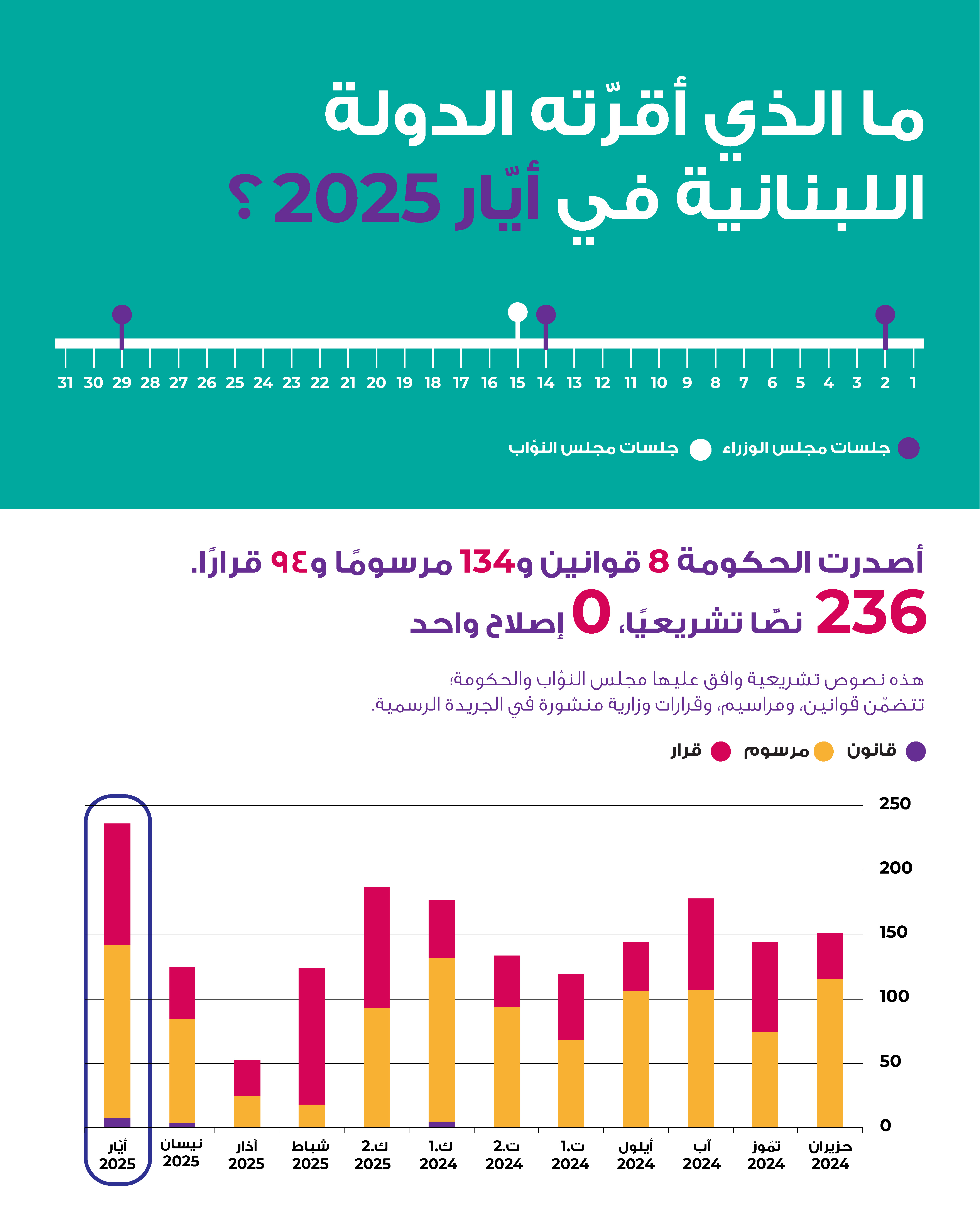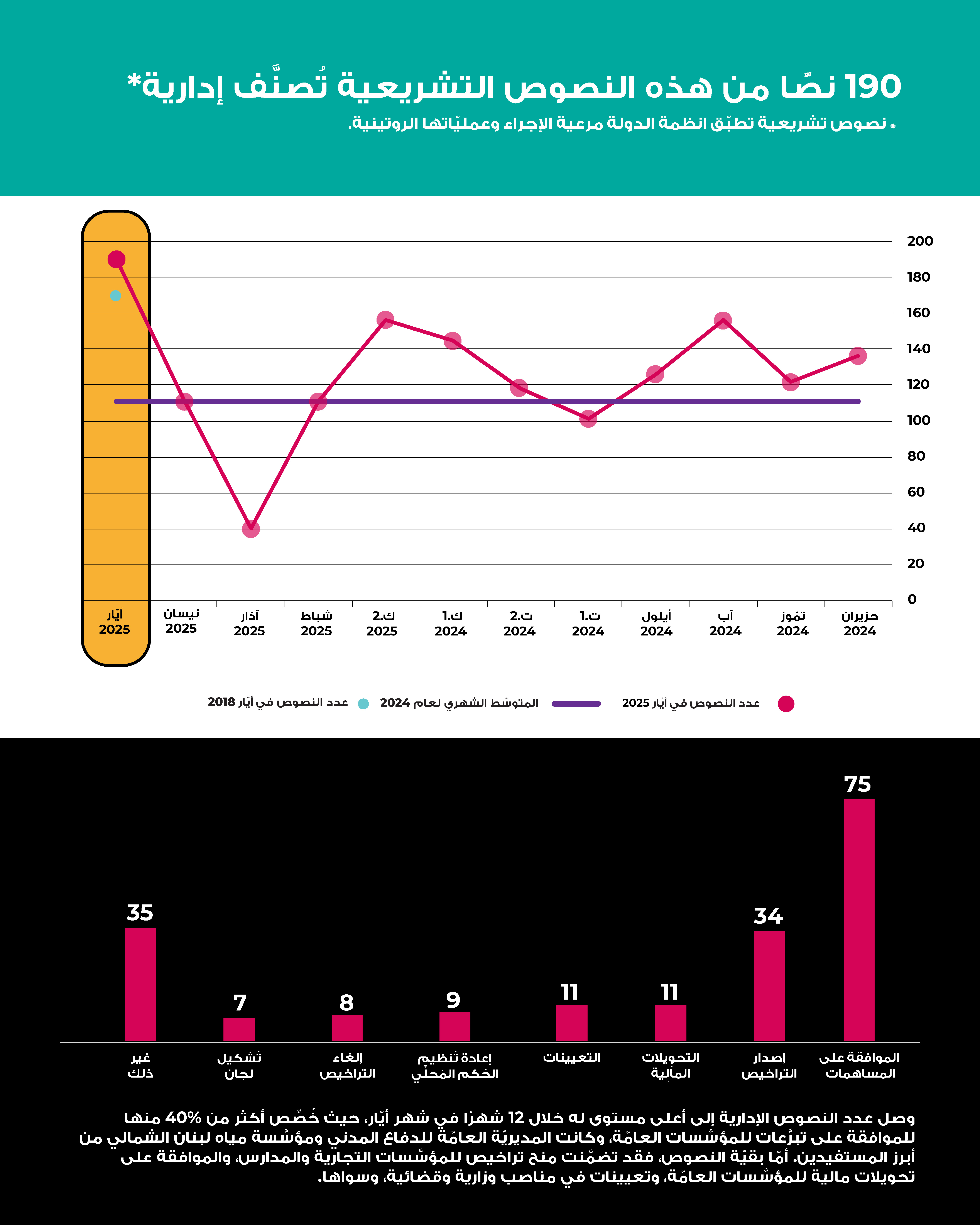 في أيّار 2025، أقرَّت الدولة اللبنانية 236 نصًّا تشريعيًّا، وهو أعلى مجموع شهريّ منذ تسلُّم الحكومة الجديدة مهامّها. تركَّزَ النشاط بدرجة كبيرة على إقرار هِبات للمؤسَّسات العامّة من أجل ضمان استمراريّة عملها، وعلى منح تراخيص للشركات والجمعيّات، وقد شكَّل هذان المحوران نحو نصف النصوص الصادرة. وبلغت الهبات المُقرَّة هذا الشهر ثاني أعلى مستوى شهريّ خلال السنوات التسع الماضية. أمّا النصوص المتبقِّية فتمحورت حول تمديد المهل الضريبيّة والإعفاءات، وإلغاء الامتحانات الرسمية المهنية لهذا العام، وترقية ضبّاط أمن كانت ترقياتهم مجمَّدة، وغيرها.