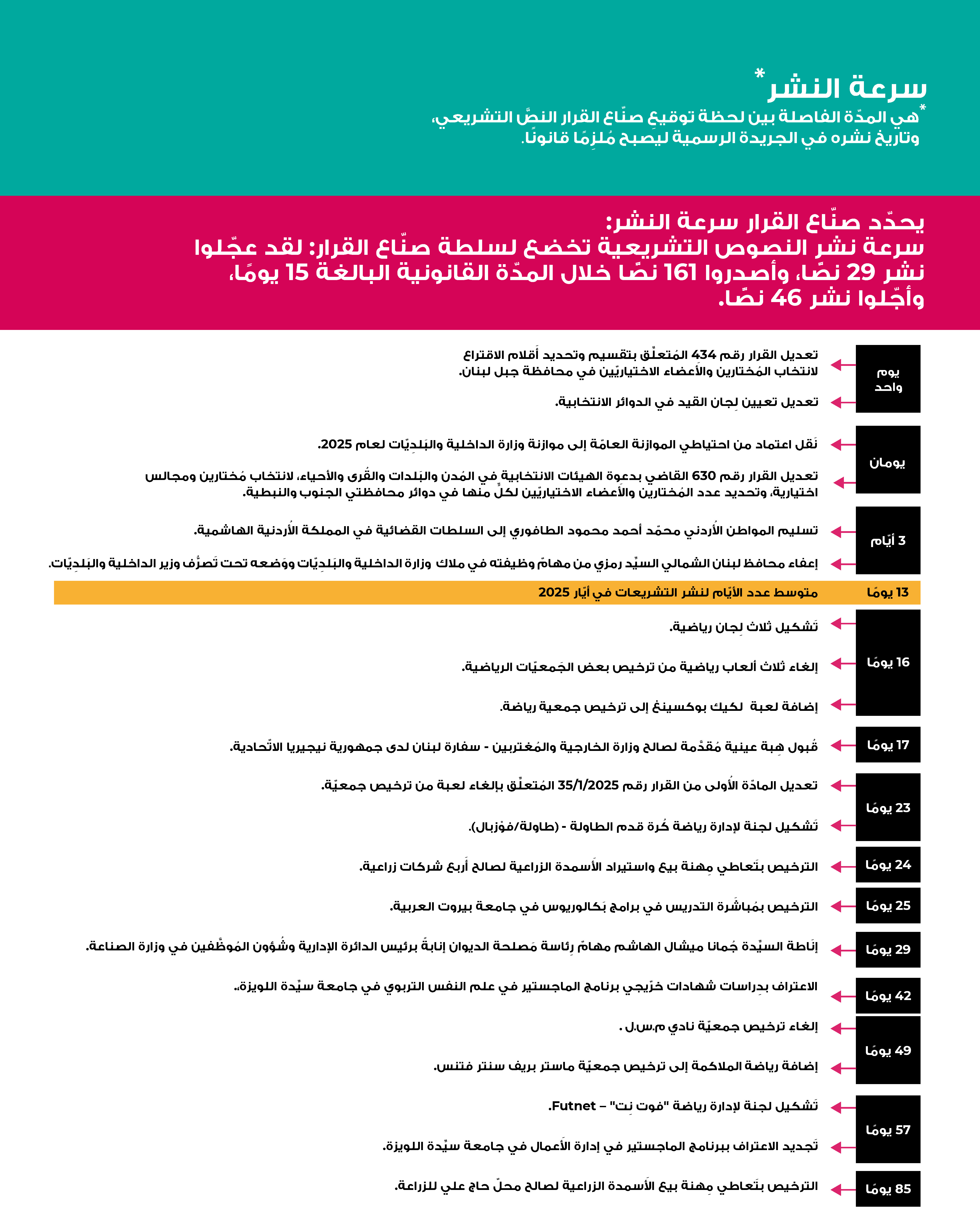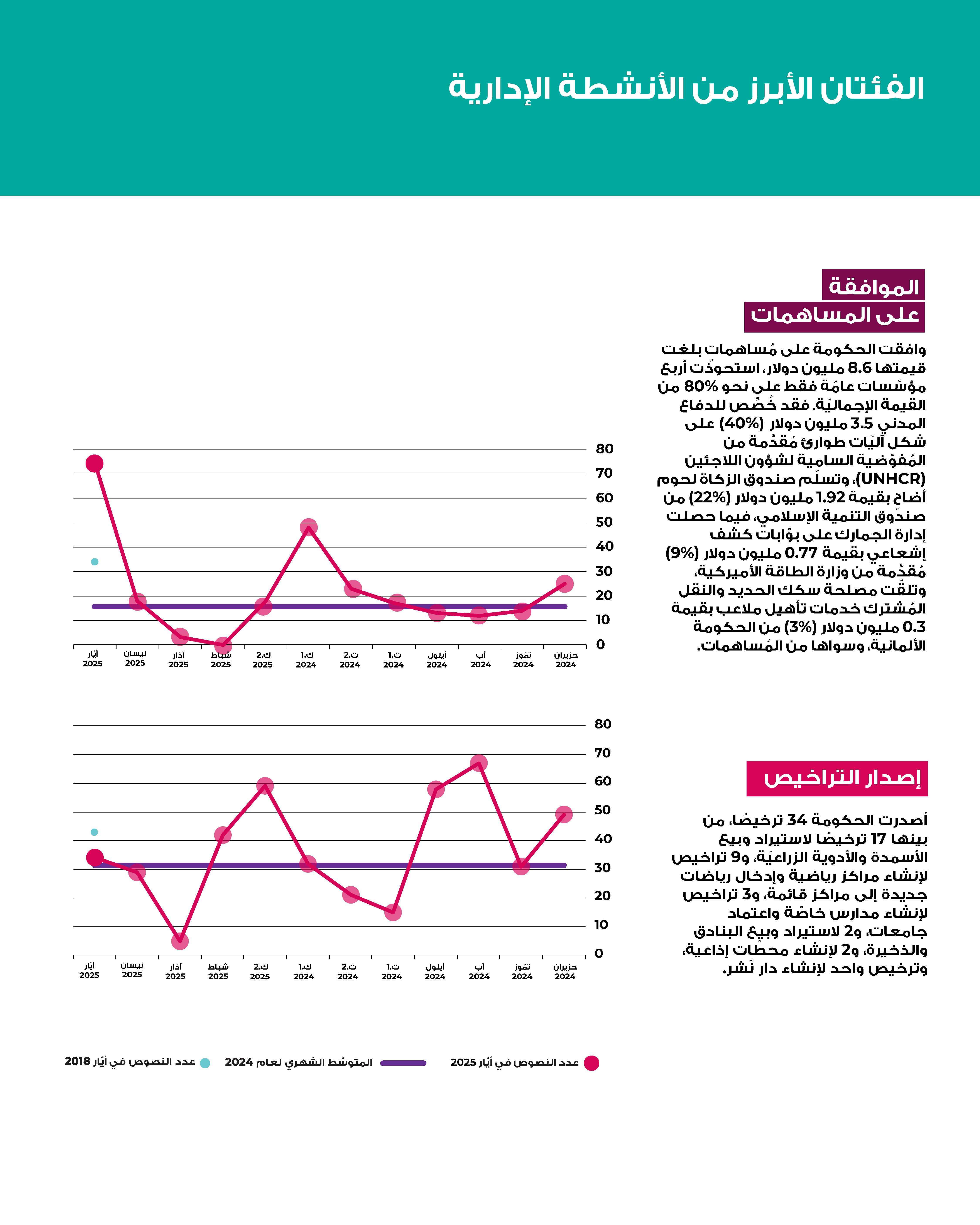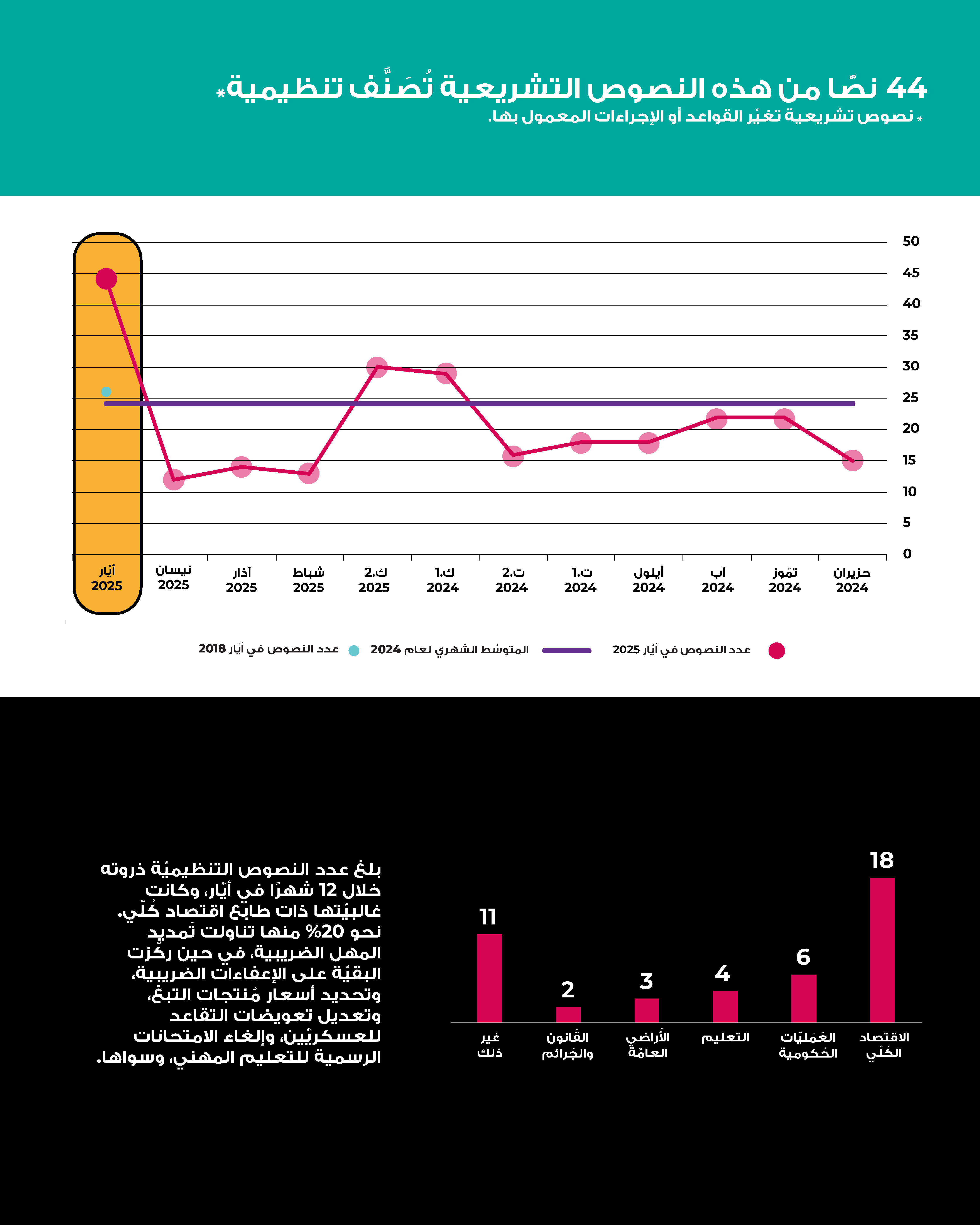في أيّار 2025، أقرَّت الدولة اللبنانية 236 نصًّا تشريعيًّا، وهو أعلى مجموع شهريّ منذ تسلُّم الحكومة الجديدة مهامّها. تركَّزَ النشاط بدرجة كبيرة على إقرار هِبات للمؤسَّسات العامّة من أجل ضمان استمراريّة عملها، وعلى منح تراخيص للشركات والجمعيّات، وقد شكَّل هذان المحوران نحو نصف النصوص الصادرة. وبلغت الهبات المُقرَّة هذا الشهر ثاني أعلى مستوى شهريّ خلال السنوات التسع الماضية. أمّا النصوص المتبقِّية فتمحورت حول تمديد المهل الضريبيّة والإعفاءات، وإلغاء الامتحانات الرسمية المهنية لهذا العام، وترقية ضبّاط أمن كانت ترقياتهم مجمَّدة، وغيرها.